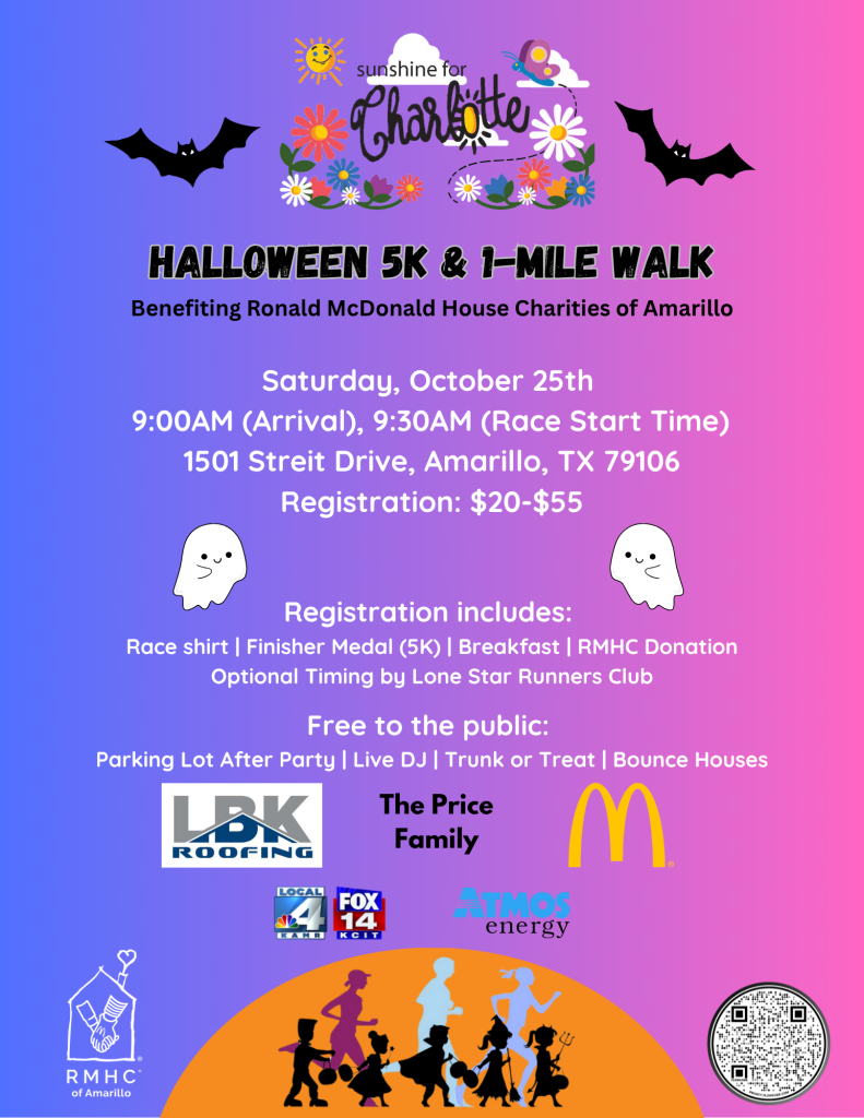 Join us to run or walk in loving memory of Charlotte Leighann Price (10/25/16-11/6/16) on Saturday, October 25th. All participants will receive a 2025 Sunshine for Charlotte t-shirt, finisher medal (5K option only), race bib, a donation in your name to the Ronald McDonald House, free breakfast, and admission to the Parking Lot After Party and Trunk or Treat! Costumes are welcome, so feel free to come dressed as someone other than yourself!
